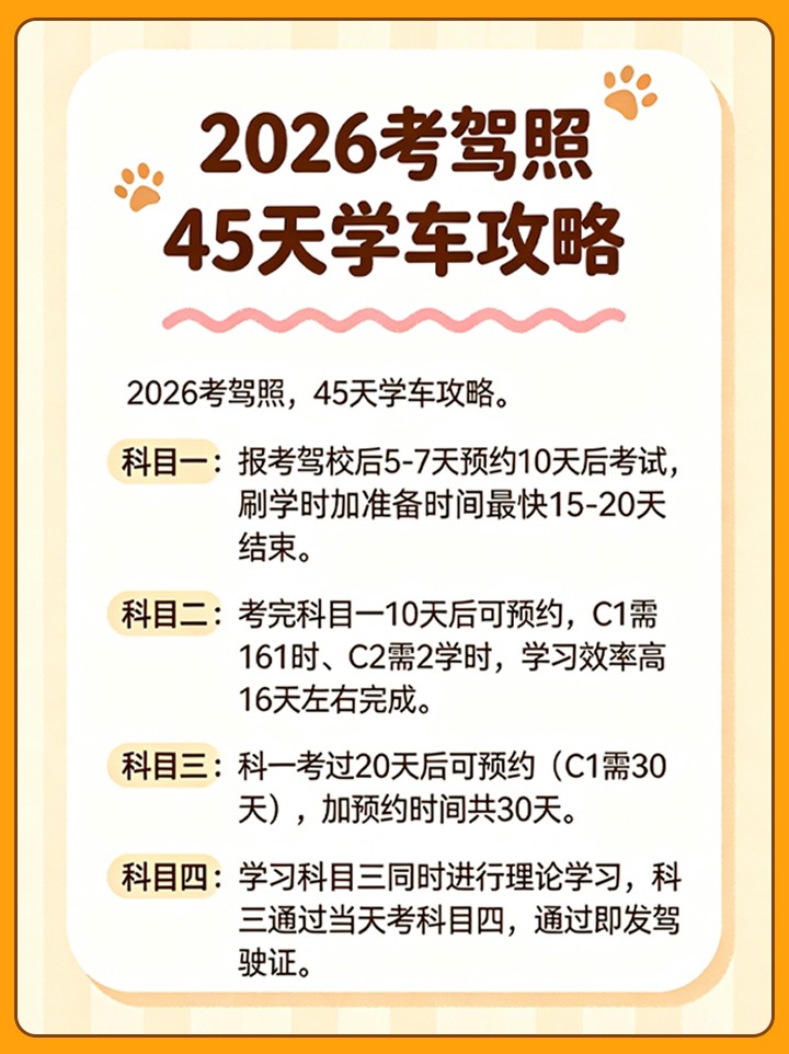 科一(15-20天)→科二(16天左右)→科三+科四(30天联考)
