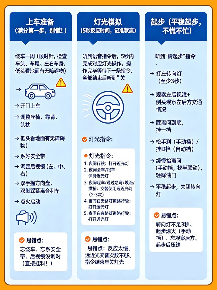 ✅ 起步:左灯3秒+观察+松手刹+平稳抬离合
